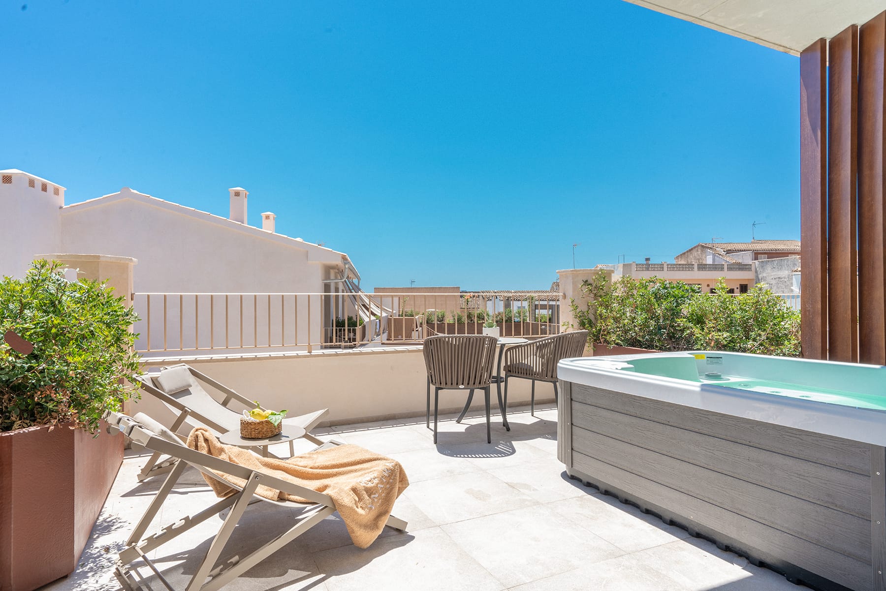 Habitación luminosa con amplia terraza y jacuzzi privado, perfecta para relajarse al sol y disfrutar de las vistas al jardín y la llanura mallorquina.