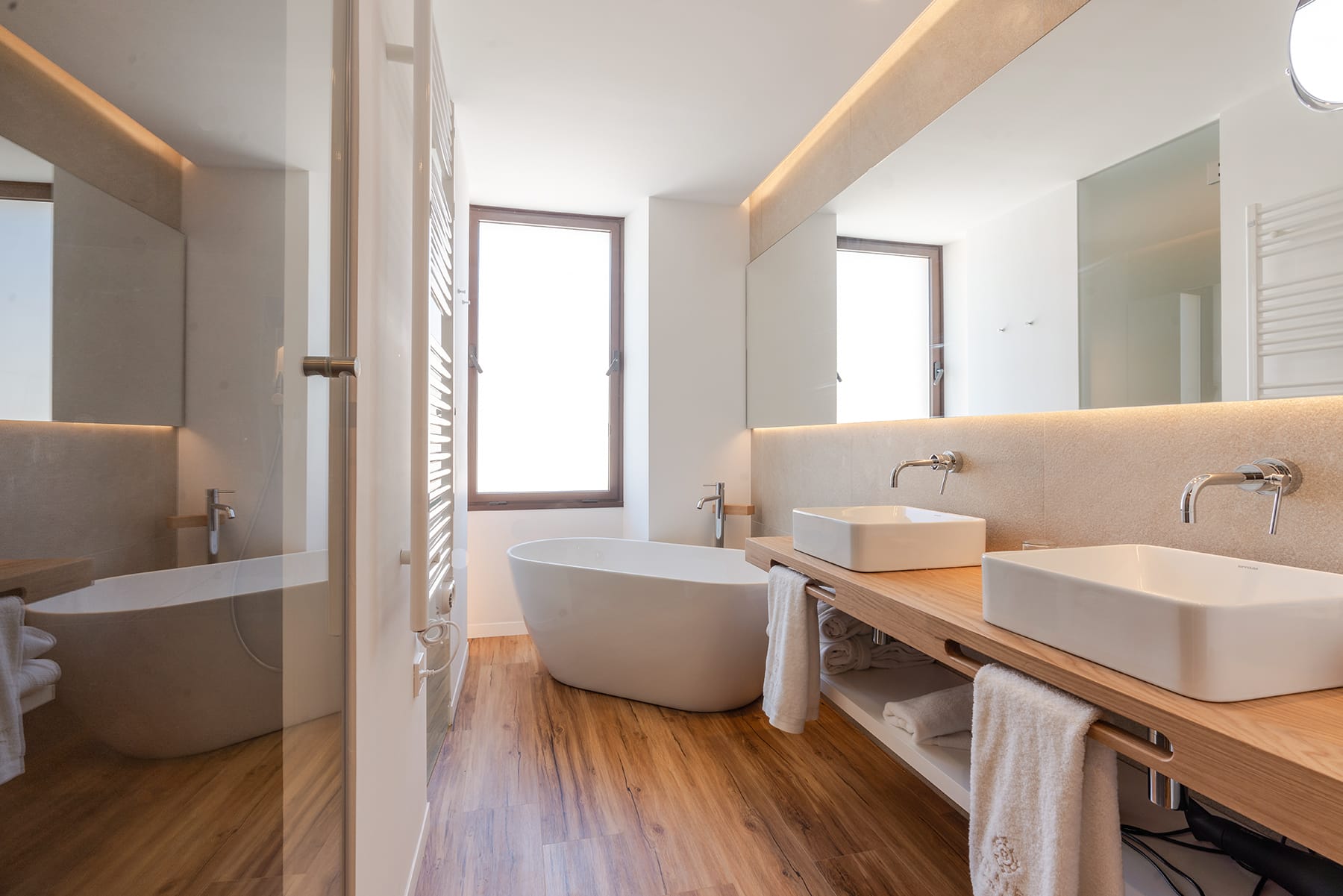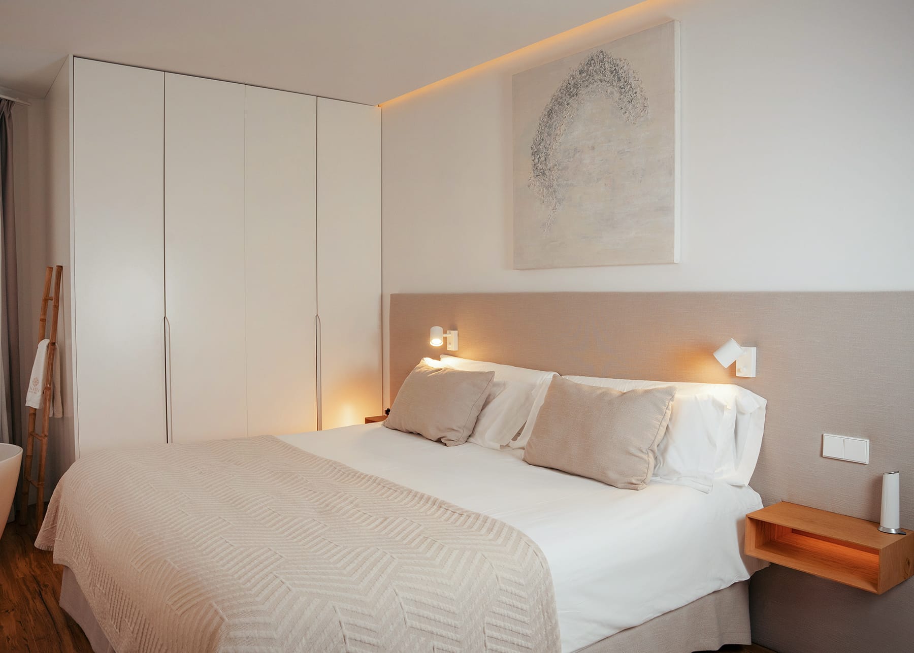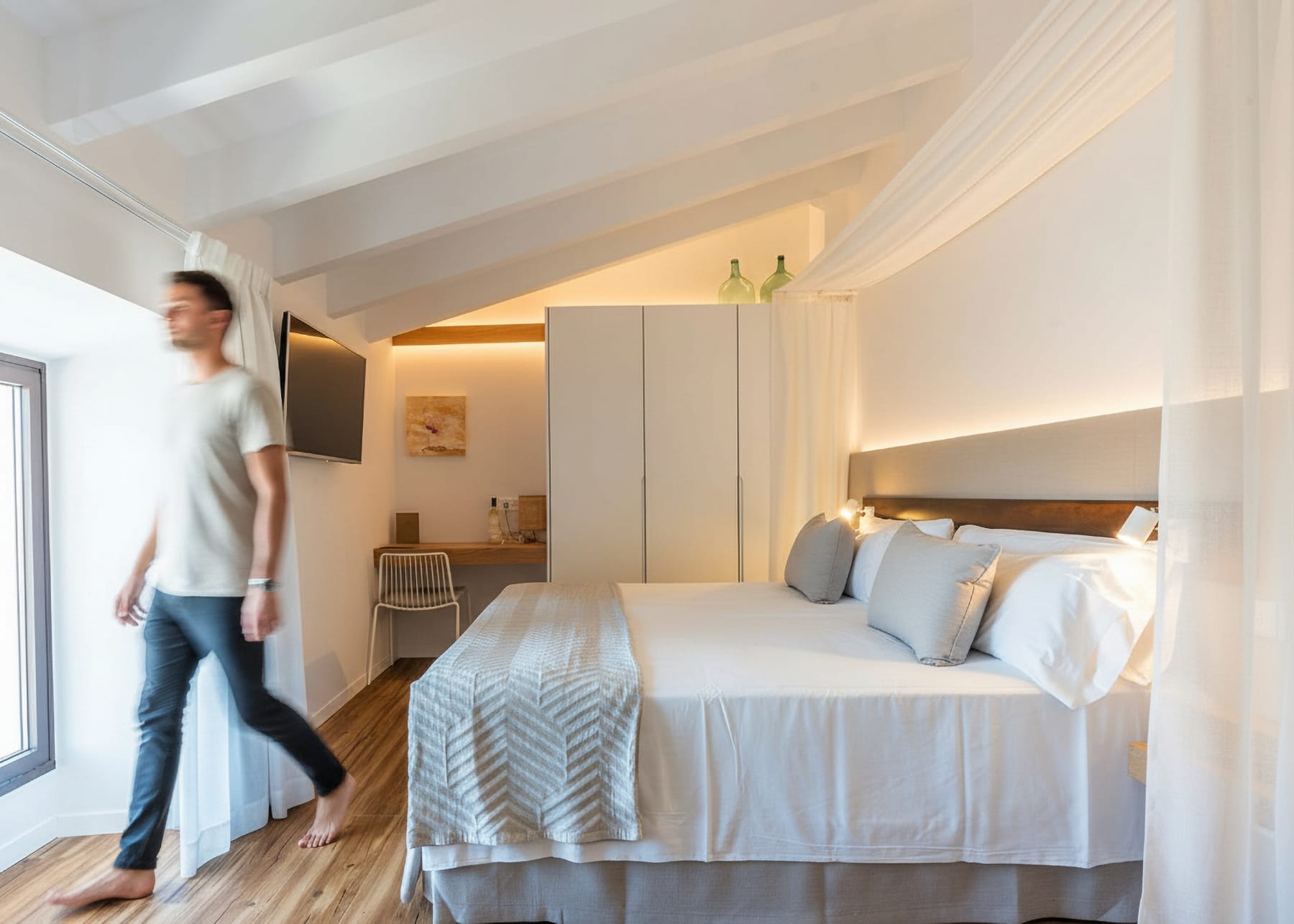 Cama King size (200 × 200) con dosel, bañera junto a una amplia ventana, escritorio, espejo de cuerpo entero, minibar con agua de cortesía, cafetera y tetera, caja fuerte con enchufe y espacio para portátil, TV con Chromecast, wifi, aire acondicionado frío/calor, y baño con ducha efecto lluvia, secador, radiador de toallas y amenities de lujo. Decoración con obras de arte locales y luz natural en todo el espacio.