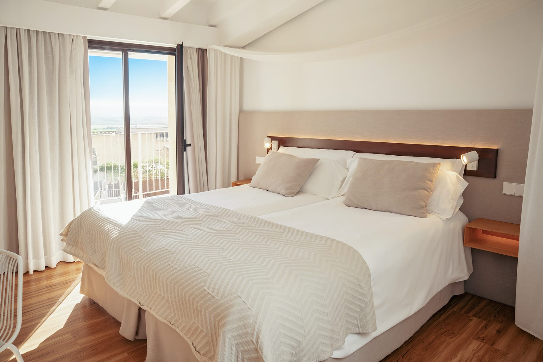 Habitación luminosa con terraza privada y vistas despejadas, ideal para disfrutar de un ambiente tranquilo y sofisticado.